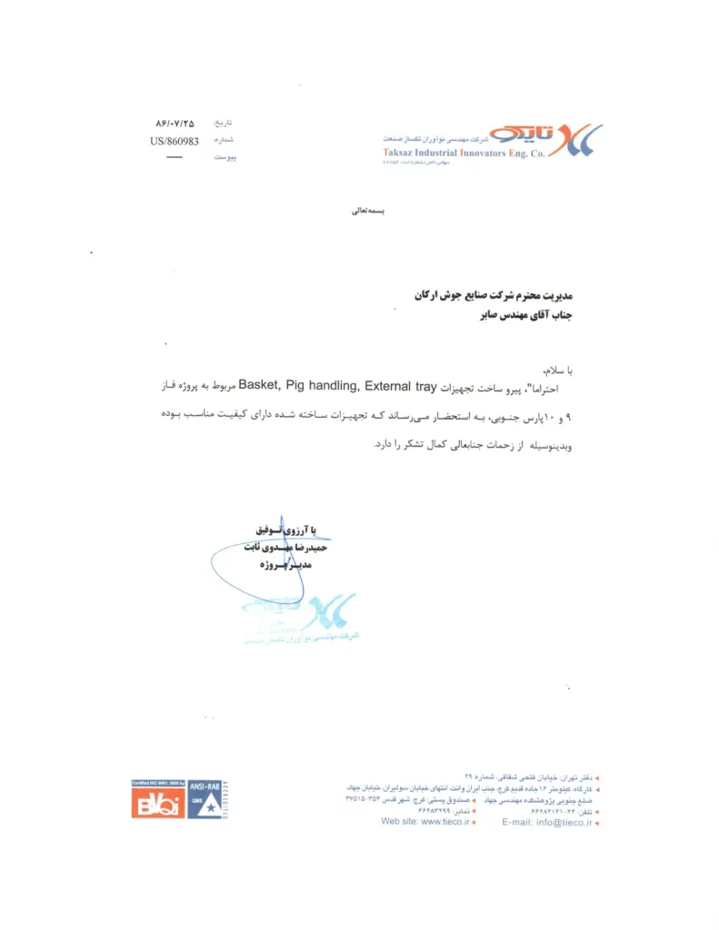 تقدیرنامه تایکو 2 توسط صنایع جوش ارکان 5 شهریور 1403 تقدیر نامه و تائیدیه ها پست قبلی تقدیر نامه مواد کاران پست بعدی شرکت پرتو